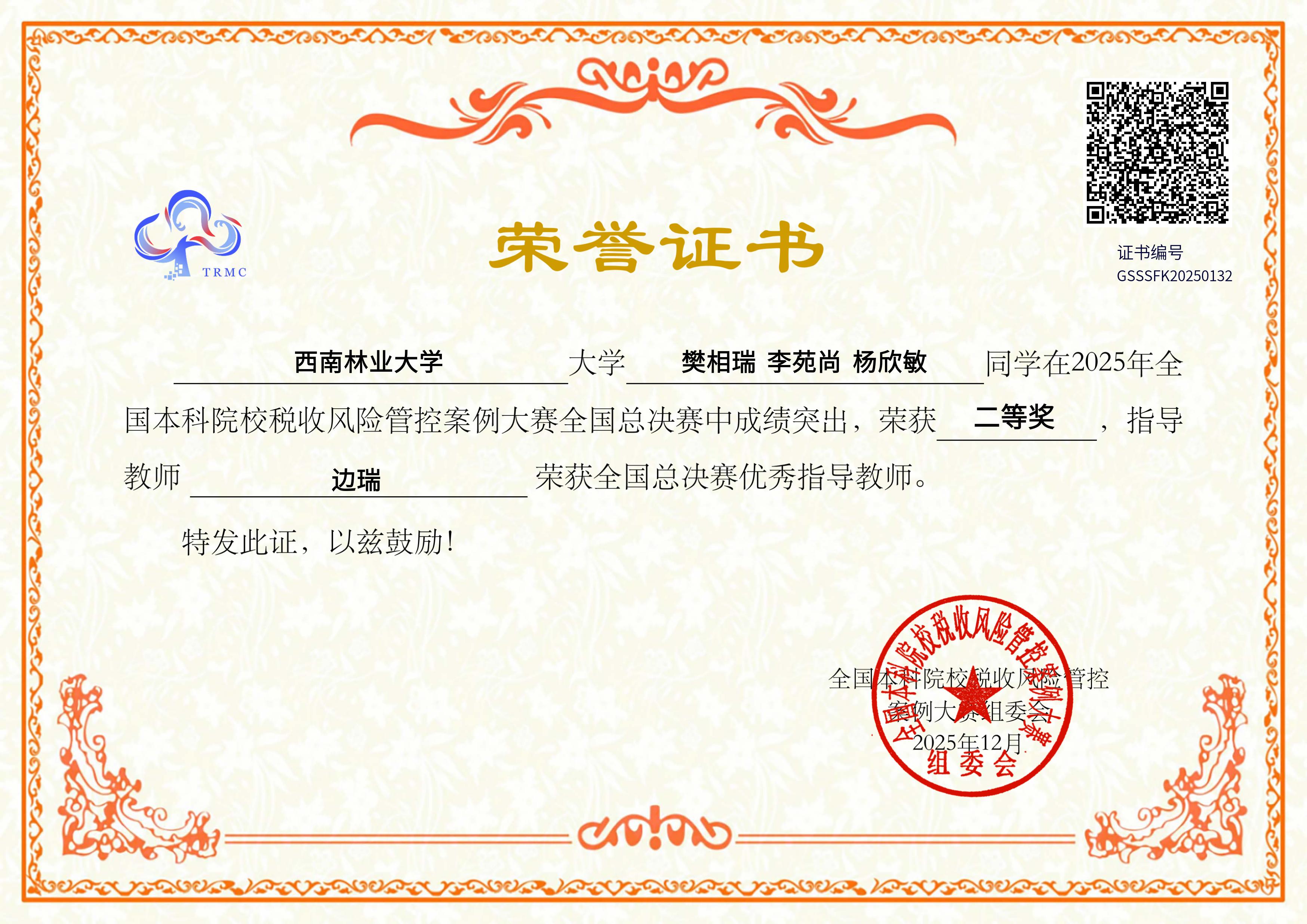 12月6日,2025年全国本科院校税收风险管控案例大赛总决赛在浙江财经大学顺利举办。本届大赛由全国本科院校税收风险管控案例大赛组委会主办,全国税务专业学位研究生教育指导委员会、浙江省注册税务师协会指导,浙江财经大学承办。本届大赛共有来自全国31个省(自治区、直辖市)的434所院校、4340支队伍、13020名选手参加比赛,收到参赛作品3831份,180支队伍晋级总决赛。最终,学院由樊相瑞、李苑尚、杨欣敏组成的“QQ星”队伍(指导老师:边瑞)在本次总决赛中荣获国家级二等奖。